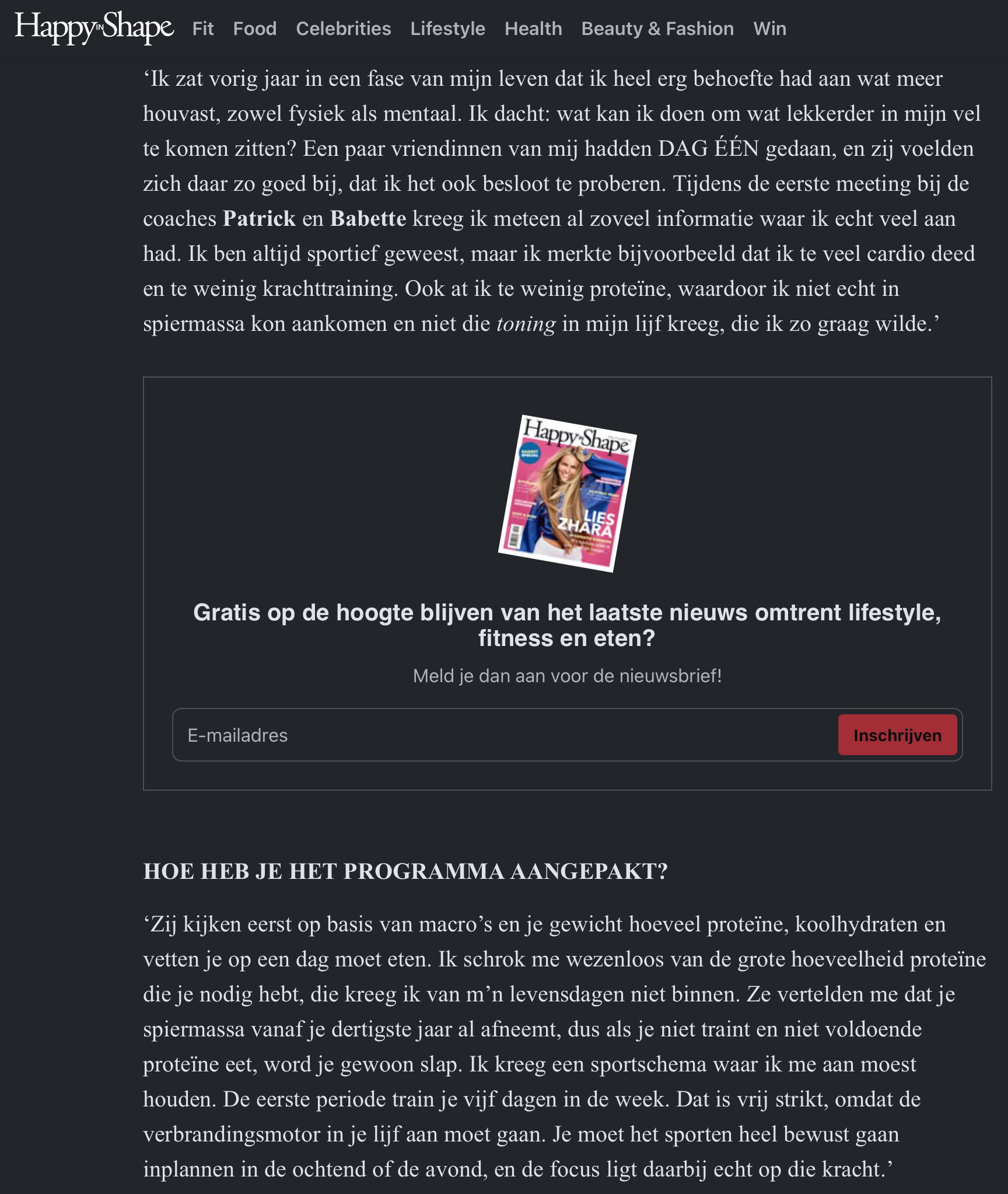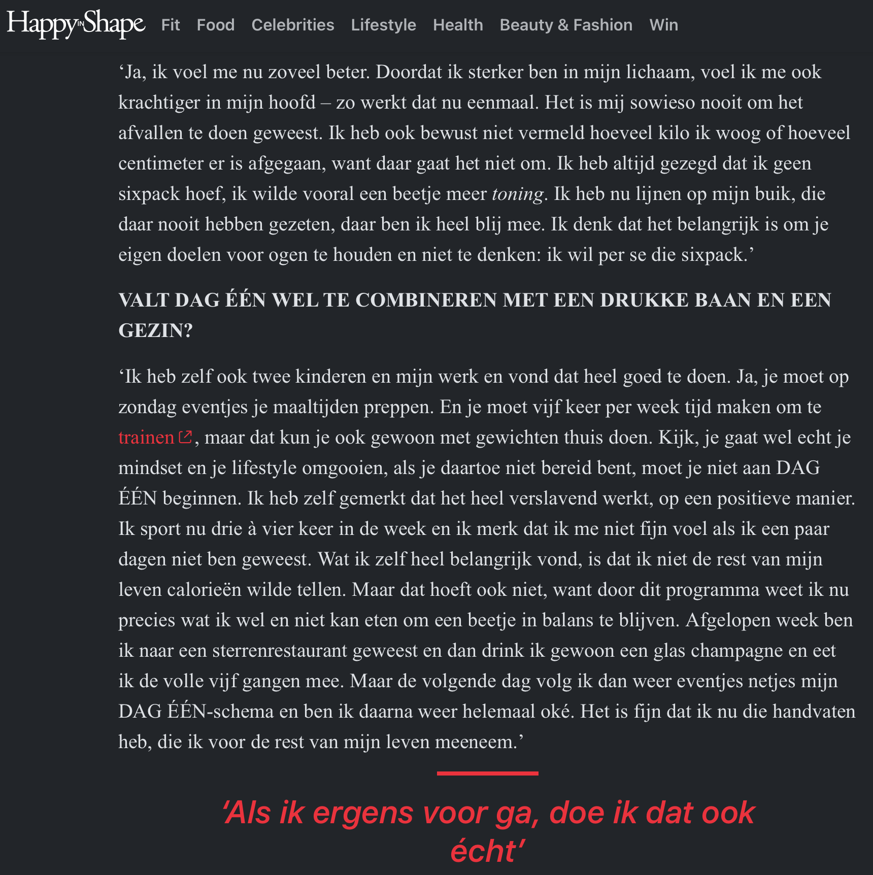 Moeite met opstaan, Altijd moe na de lunch, bepaalde eetgewoontes die erin gesleten waren... Ik gunde mezelf fysiek en mentaal een reset. Al maanden zag ik alle geweldige resultaten van DAG ÉÉN voorbij komen, maar ergens voelde het ook eng om dat belletje te maken. Maar toen ik eenmaal die knop omzette, ging ik vol energie naar de eerste meeting (check de laatste slide hoe ik binnen kwam & gisteren naar buiten liep 🥰). Nu ben ik behoorlijk gedisciplineerd, dus werkte het perfect voor mij dat Patrick alle workouts klaarzette in de app & Babette je eetschema, waardoor ik alleen maar hoefde te volgen wat zij mij voorschotelden. En ik vind het echt ongelofelijk hoe goed dit werkte! Al na anderhalve week voelde ik me veel energieker, niet alleen fysiek maar ook mentaal. Nu, 6 weken later, eet ik meer dan ooit en omdat ik nu de juiste macroverhoudingen weet in combinatie met krachttraining, voelt dit écht als een 'new way of life'. Ik deel expres geen cijfers, want het gaat er vooral om hoe ik me nu voel: en dat is zowel mentaal als fysiek sterker dan ooit 🫶