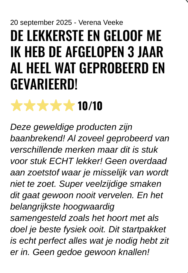 Deze geweldige producten zijn baanbrekend! Al zoveel geprobeerd van verschillende merken maar dit is stuk voor stuk ECHT lekker! Geen overdaad aan zoetstof waar je misselijk van wordt niet te zoet. Super veelzijdige smaken dit gaat gewoon nooit vervelen. En het belangrijkste hoogwaardig samengesteld zoals het hoort met als doel je beste fysiek ooit. Dit startpakket is echt perfect alles wat je nodig hebt zit er in. Geen gedoe gewoon knallen!