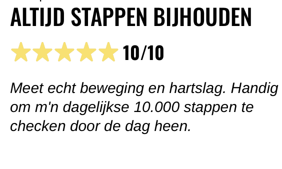 Meet echt beweging en hartslag. Handig om m'n dagelijkse 10.000 stappen te checken door de dag heen.