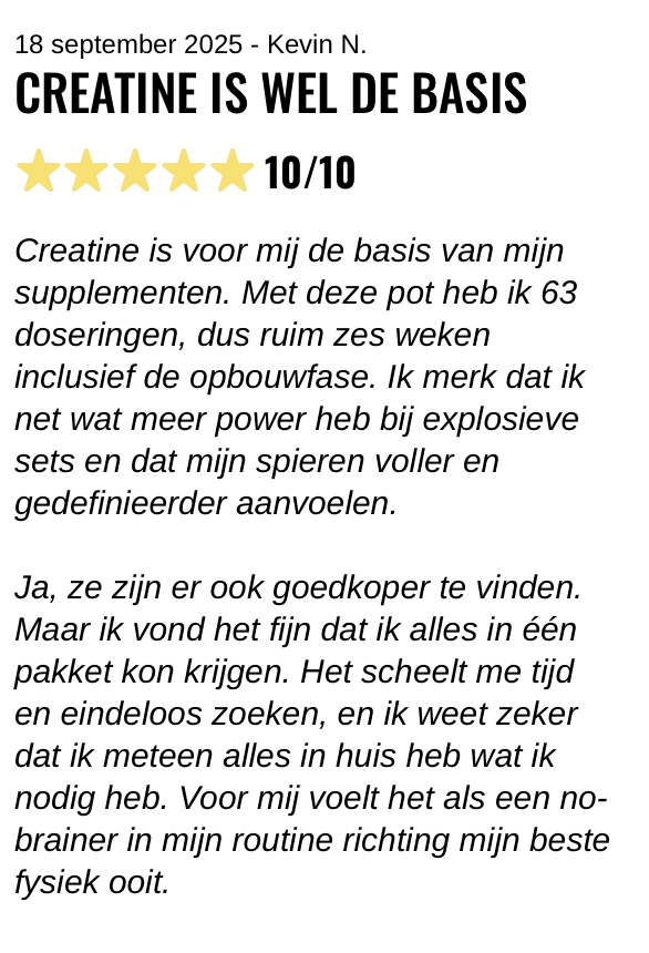 Creatine is voor mij de basis van mijn supplementen. Met deze pot heb ik 63 doseringen, dus ruim zes weken inclusief de opbouwfase. Ik merk dat ik net wat meer power heb bij explosieve sets en dat mijn spieren voller en gedefinieerder aanvoelen.