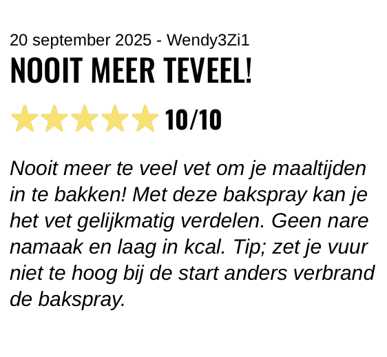 Nooit meer te veel vet om je maaltijden in te bakken! Met deze bakspray kan je het vet gelijkmatig verdelen. Geen nare namaak en laag in kcal. Tip; zet je vuur niet te hoog bij de start anders verbrand de bakspray.