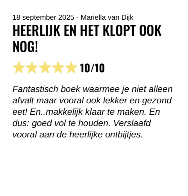 Fantastisch boek waarmee je niet alleen afvalt maar vooral ook lekker en gezond eet! En..makkelijk klaar te maken. En dus: goed vol te houden. Verslaafd vooral aan de heerlijke ontbijtjes.