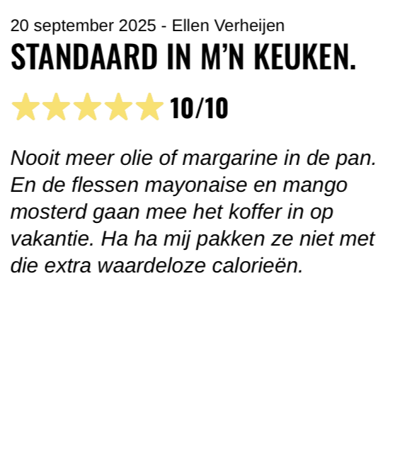 Nooit meer olie of margarine in de pan. En de flessen mayonaise en mango mosterd gaan mee het koffer in op vakantie. Ha ha mij pakken ze niet met die extra waardeloze calorieën.