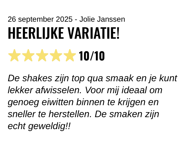 De shakes zijn top qua smaak en je kunt lekker afwisselen. Voor mij ideaal om genoeg eiwitten binnen te krijgen en sneller te herstellen. De smaken zijn echt geweldig!!