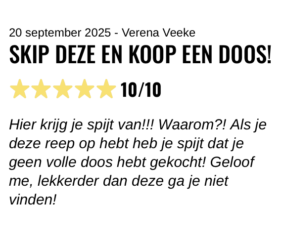 Hier krijg je spijt van!!! Waarom?! Als je deze reep op hebt heb je spijt dat je geen volle doos hebt gekocht! Geloof me, lekkerder dan deze ga je niet vinden!