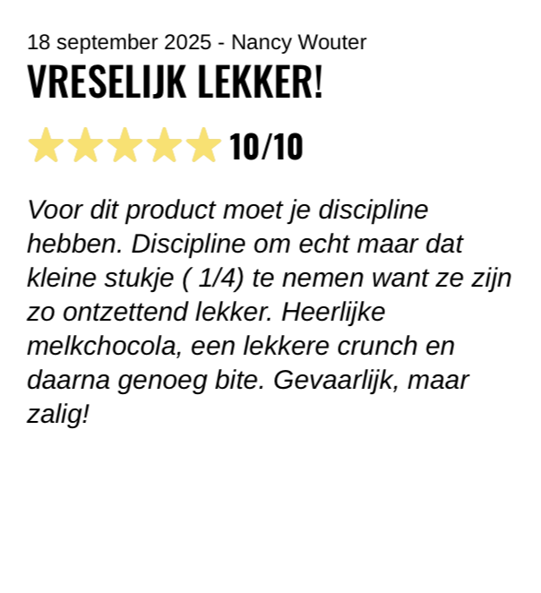 Voor dit product moet je discipline hebben. Discipline om echt maar dat kleine stukje ( 1/4) te nemen want ze zijn zo ontzettend lekker. Heerlijke melkchocola, een lekkere crunch en daarna genoeg bite. Gevaarlijk, maar zalig!