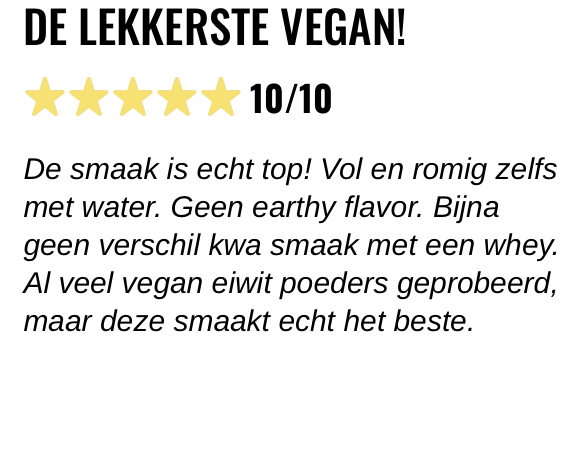 De smaak is echt top! Vol en romig zelfs met water. Geen earthy flavor. Bijna geen verschil kwa smaak met een whey. Al veel vegan eiwit poeders geprobeerd, maar deze smaakt echt het beste.