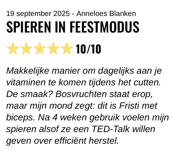 Makkelijke manier om dagelijks aan je vitaminen te komen tijdens het cutten. De smaak? Bosvruchten staat erop, maar mijn mond zegt: dit is Fristi met biceps. Na 4 weken gebruik voelen mijn spieren alsof ze een TED-Talk willen geven over efficiënt herstel.