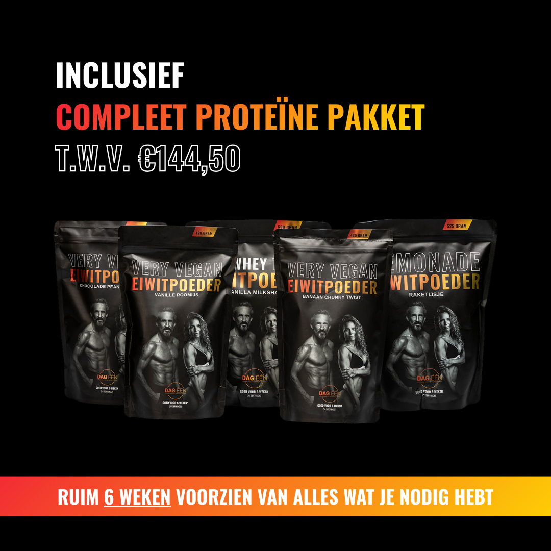 Dit pakket is het meest gekozen! Populair omdat het alles omvat wat je nodig hebt om zelf je beste fysiek te bereiken, inclusief alle eiwitpoeders en kookgerei.