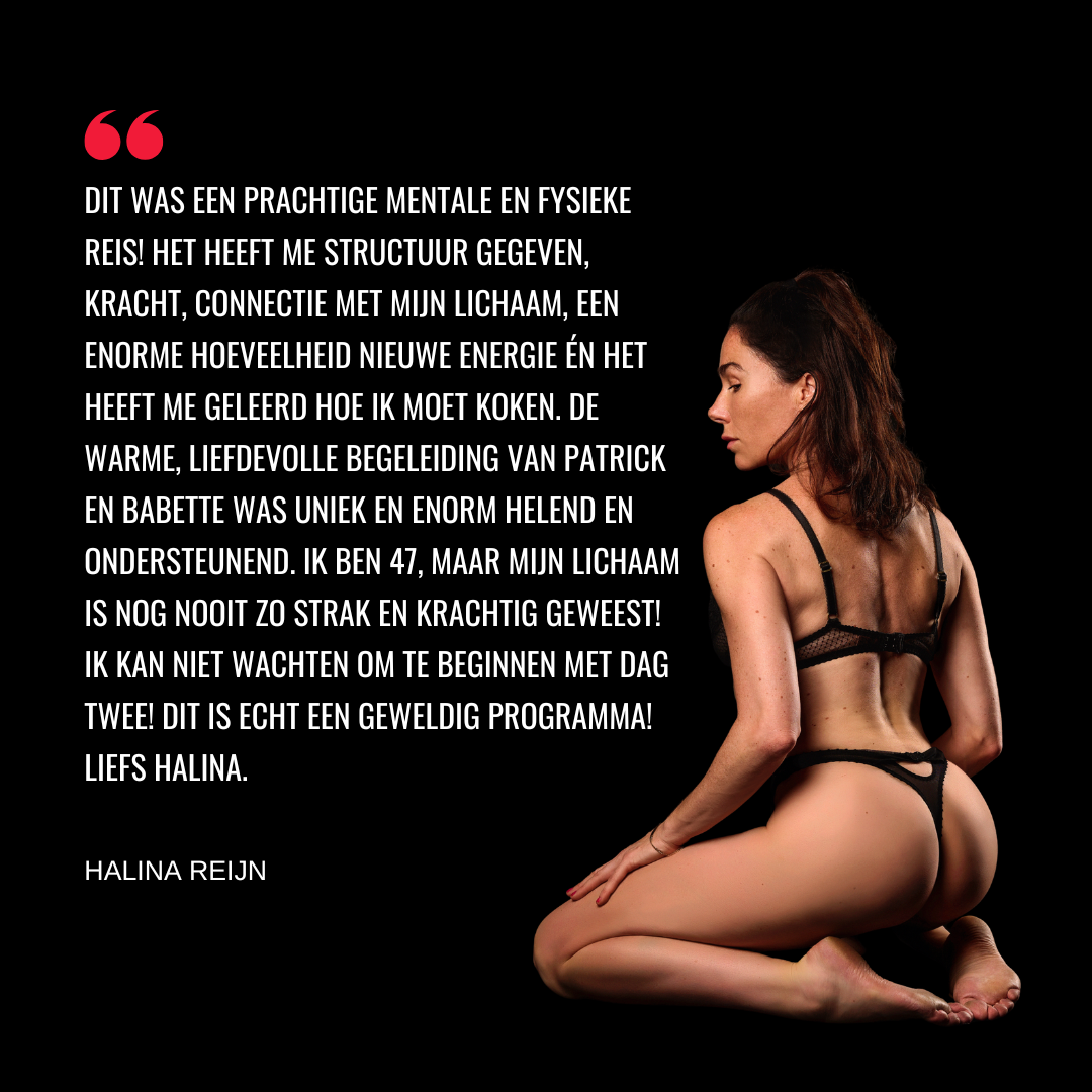 Je kan op élk moment, direct beginnen! Je stroomt hiervoor in bij een DAG TWEE groep, wordt weer ingemeten, krijgt alle supplementen, een op maat trainings- en voedingsplan én de dagelijkse begeleiding van Patrick & Babette gedurende 6 weken.