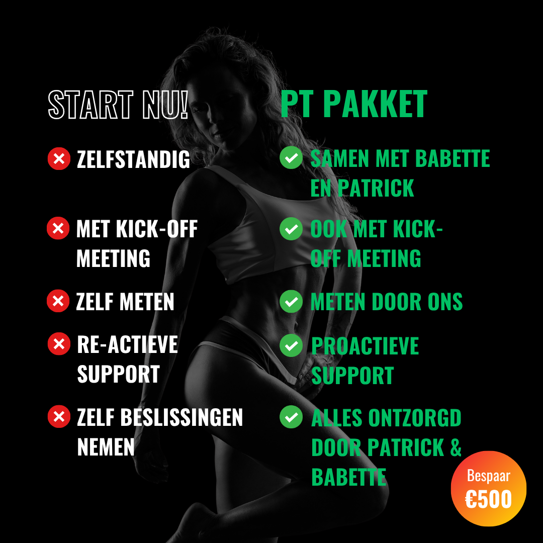 Heb je toch moeite om het alleen te doen? Laat ons je dan helpen! Als je het START NU!-Pakket al hebt kan je doorstromen naar het PT-Pakket waarbij wij je 24/7 gaan coachen! Omdat je het START-NU!-Pakket al hebt, krijg je zelfs €500 korting!